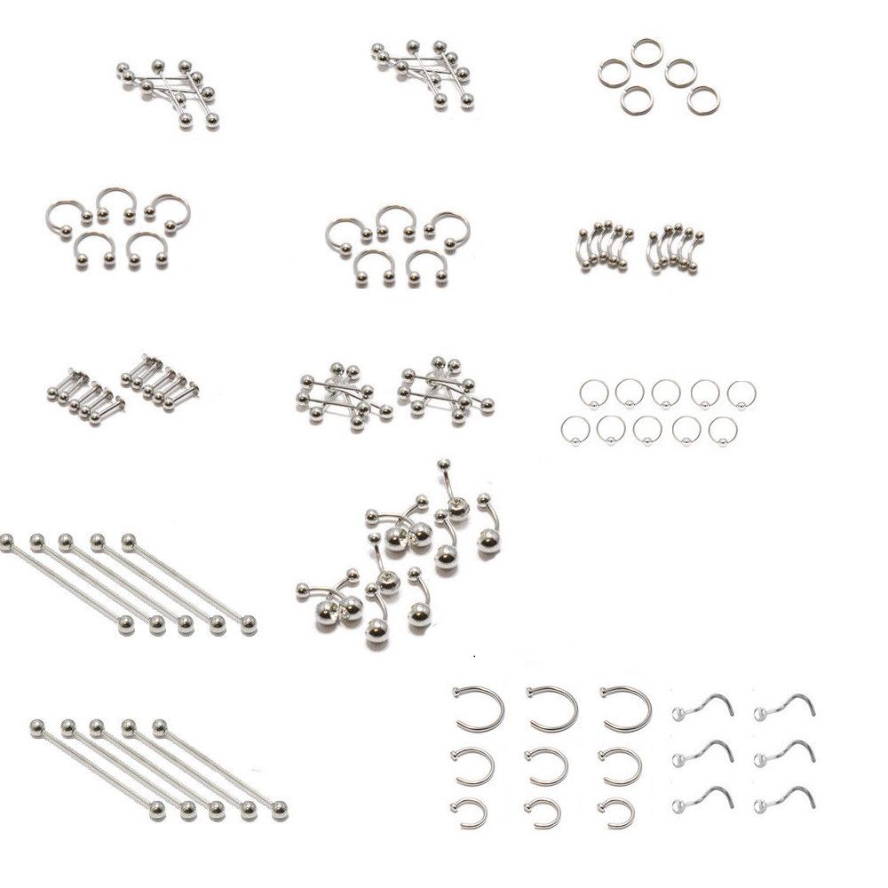 Included in this incredible kit: - 10 Industrial Barbells 14G- 1 1/2-38mm" - 10 Belly Button Ring Barbells Single Gem 14G-7/16"-11mm -10 Straight Barbells 14G-5/8"-16mm - 10 Nose Screw with Clear Jewel 18G - 10 Nose Screw with Clear Jewel 20G - 10 Hinged Clicker Hoop 14G-3/8"-10mm - 10 Horseshoe 14G-3/8"-10mm - 10 Curved Barbell 16G-5/16"-8mm - 10 Labret Monroe 16G-5/16 " -5 Replacement Balls 14G 4mm -10 Replacement Balls 16G 3mm Perfect for wholesalers, retailers or independent piercers Autoclave safe Made of 316L surgical steel - highest quality and perfect for initial piercings